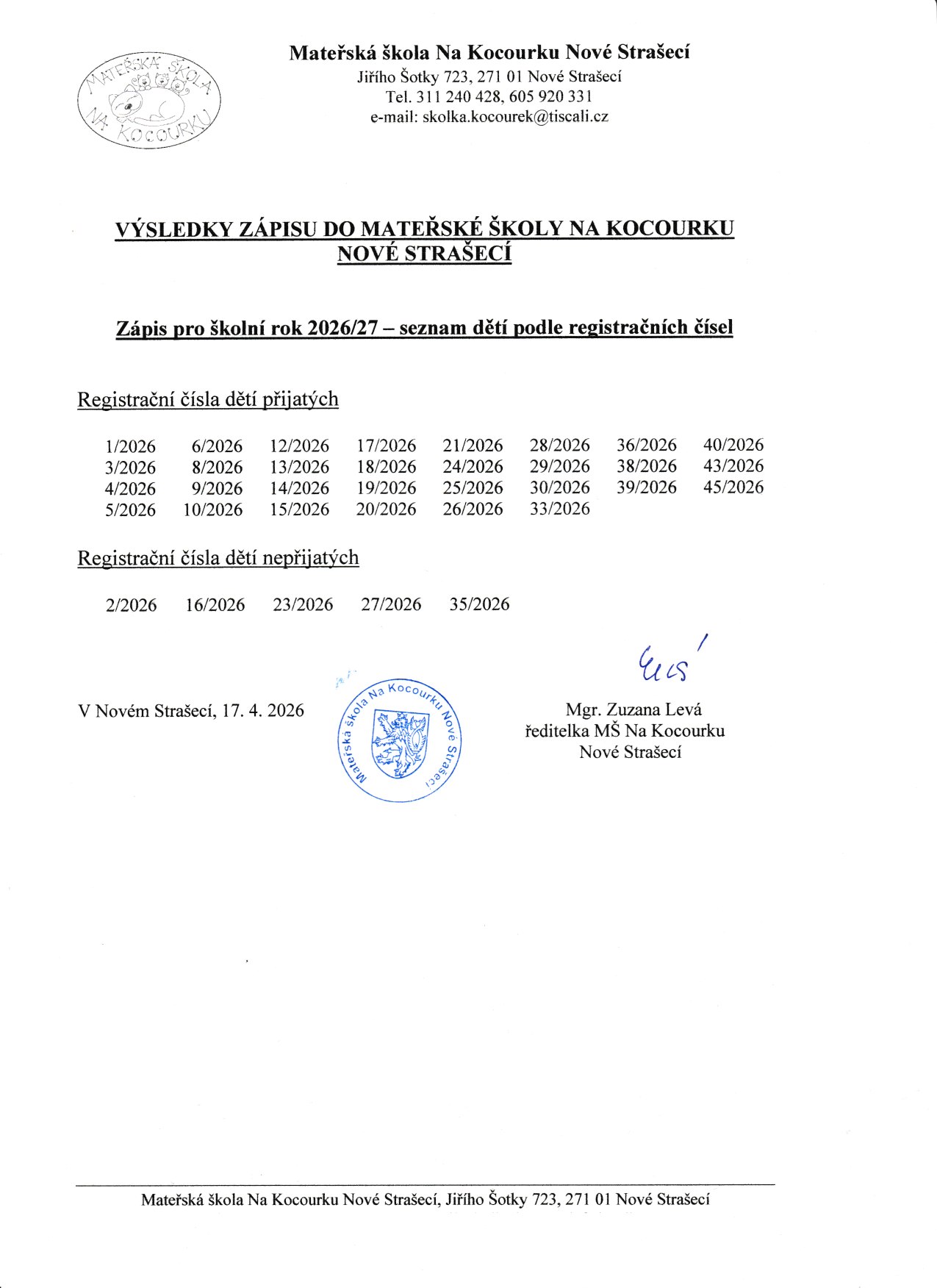 Výsledky zápisu do MŠ pro školní rok 2026-27
